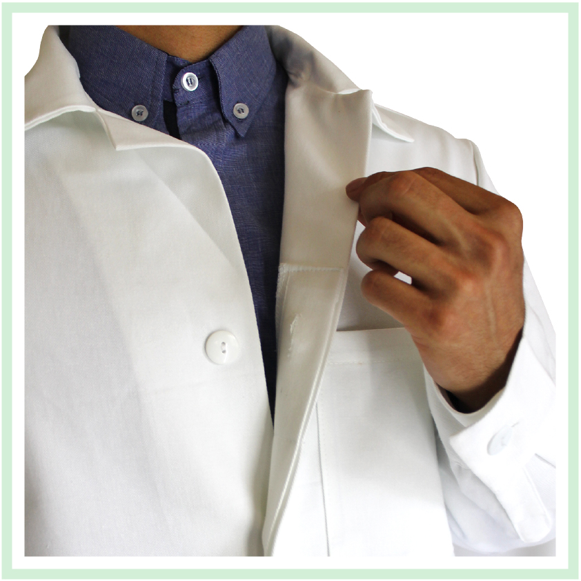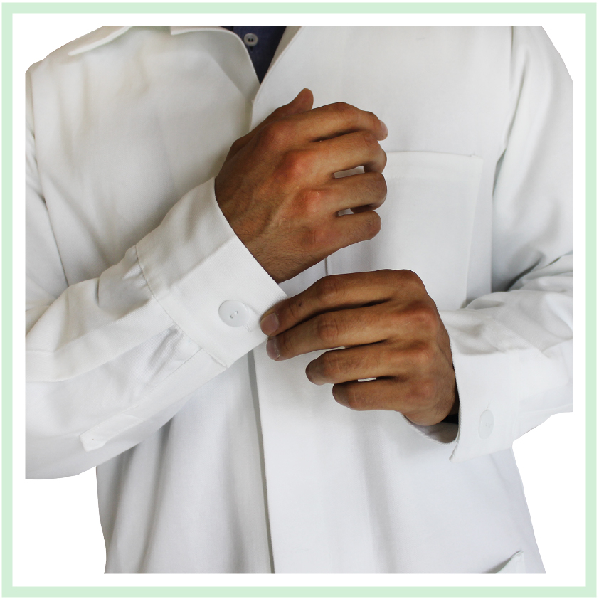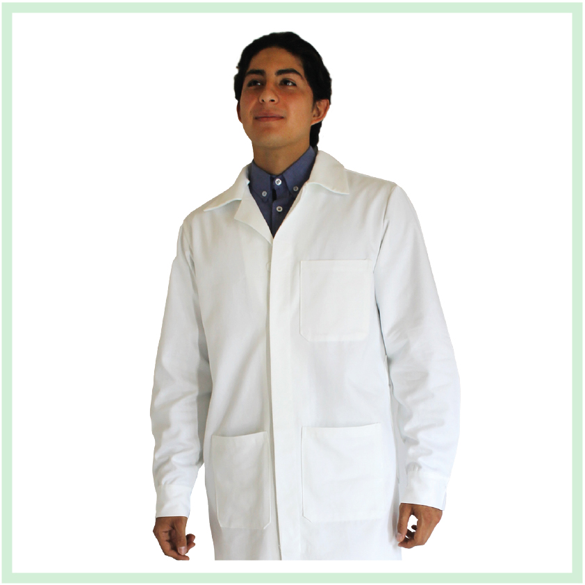 Bata básica con puño y ojalera con tres bolsas al frente.